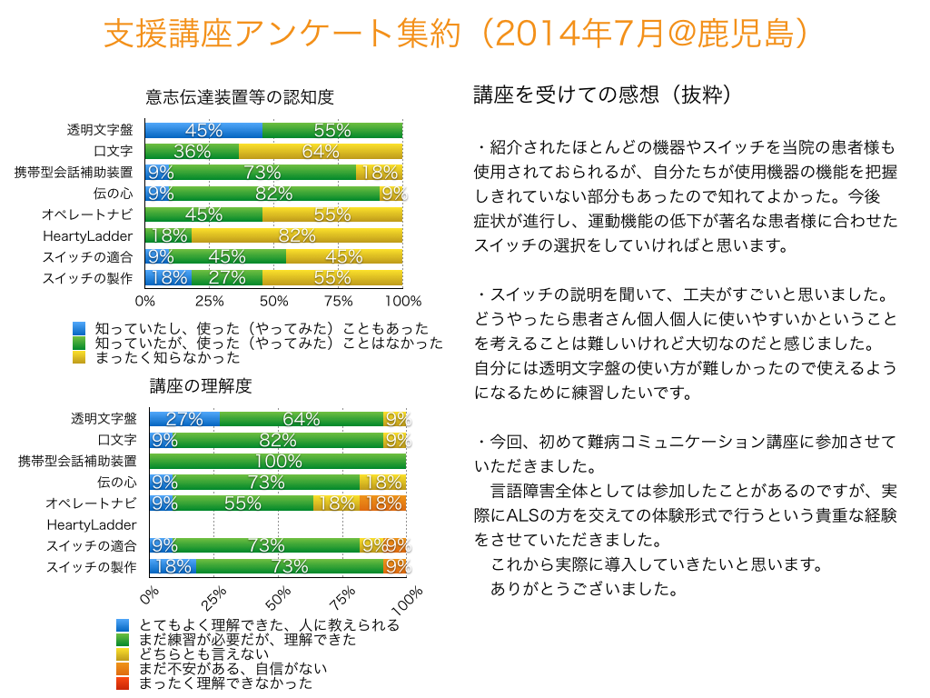 ALSなどの神経難病へのコミュニケーション支援について、基礎知識と支援機器の操作体験をまじ えた講習会です。レッツ・チャットや伝の心など患者さんがよく使われている機器を中心に、機器の基礎的な使い方から、患者様の要望・支援体制に応じた導入方法、入力スイッチの紹介・選定方 法など、さまざまな情報をご提供いたします。 佐賀県から在宅療養生活をされているALS患者さんが来てくださいます。コミュニケーションにつ いての思いや、実際のコミュニケーション方法をご紹介くださいます。ぜひ実際に患者さんとコミュニケーションをしてみてください。 セラピストや看護師などの医療職、介護職をはじめ患者さんに関わる、あるいはこれから関わろう とする支援者の方にぜひ知っていただきたい内容です。