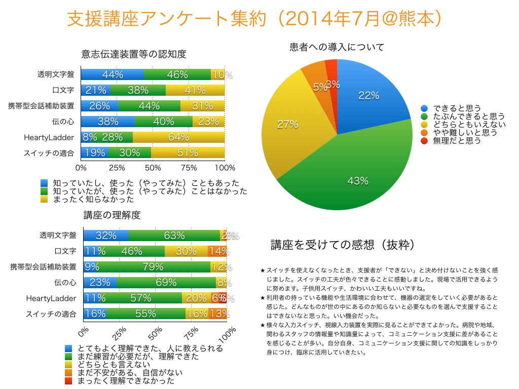 普段体験できない視線入力を患者、家族が体験でき、移動できない患者には、病室に機器を持参してその場で体験してもらいました。機器導入の道筋がつけられたため、熊本ではその後視線入力導入の動きが見られ、実際に申請手続きを行った事例がありました。