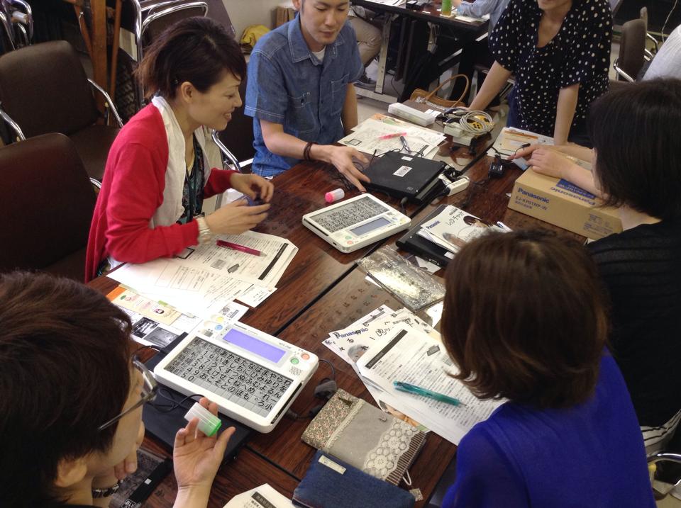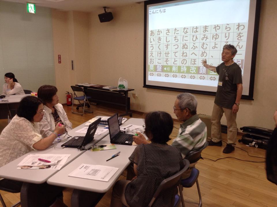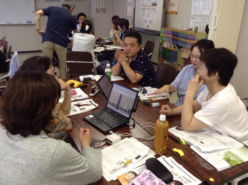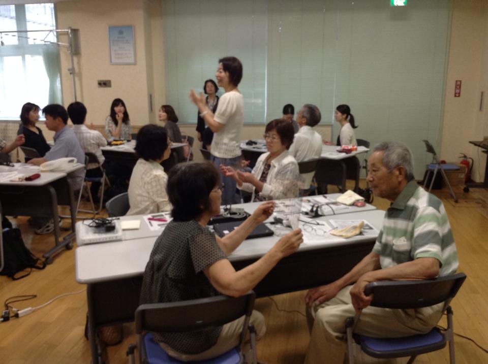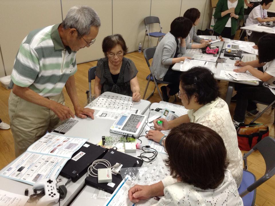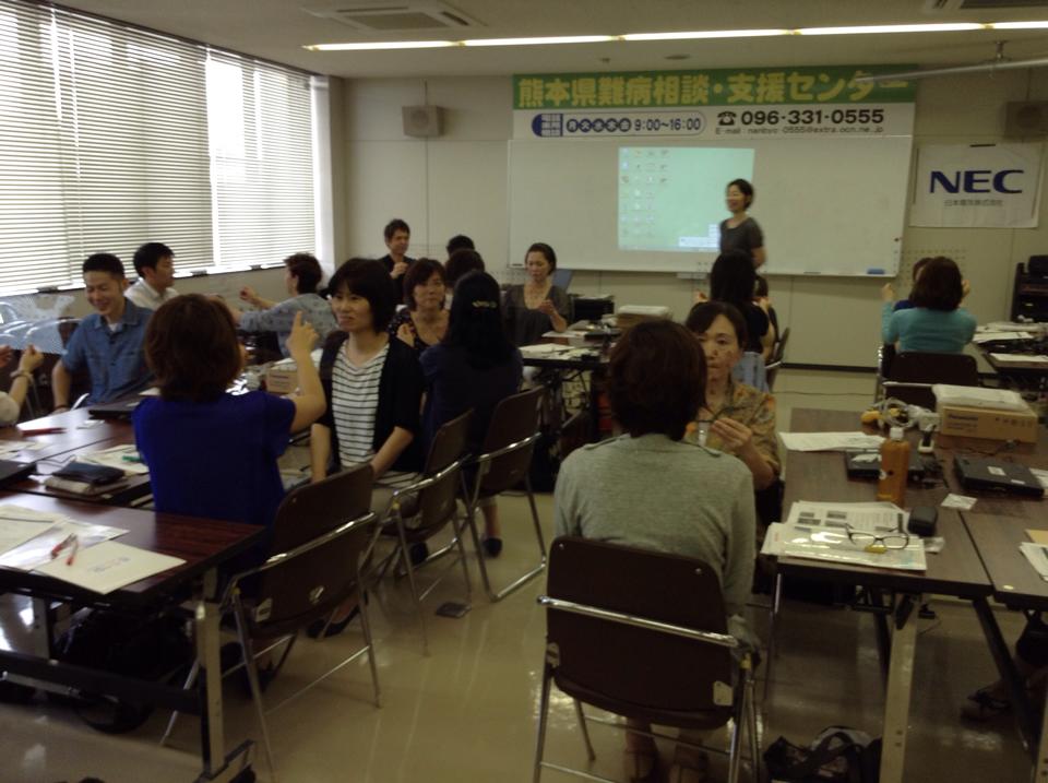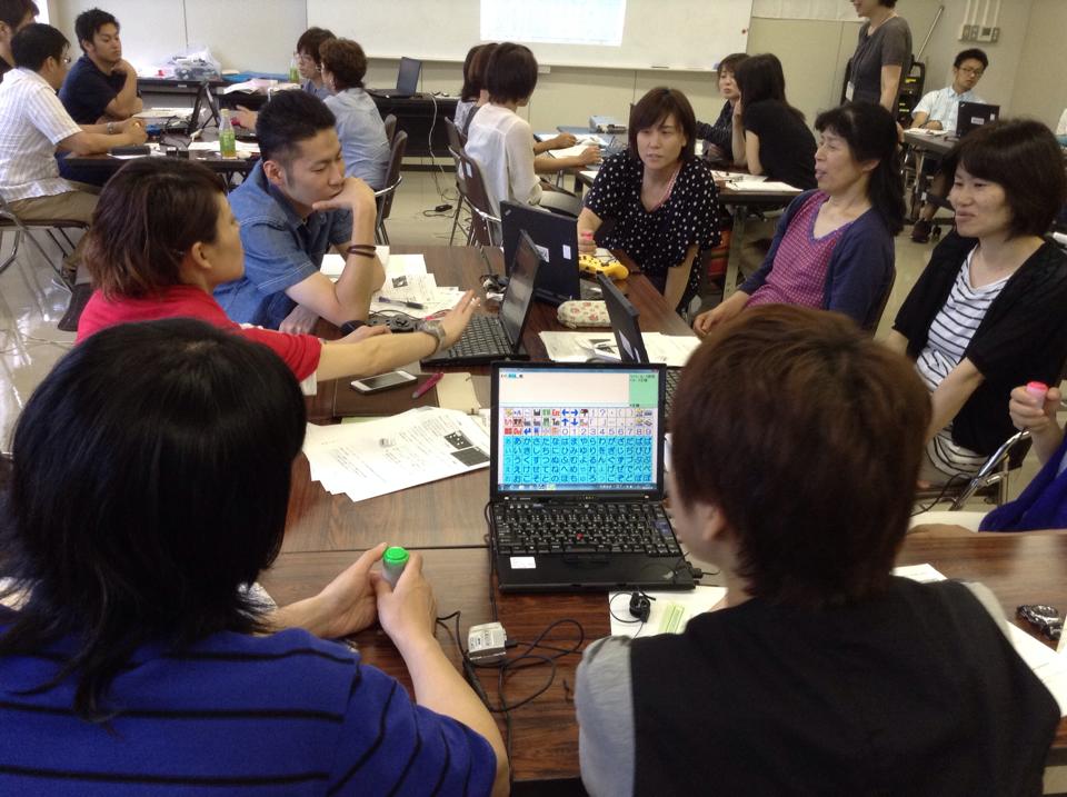 患者に最も近い家族、介護士へコミュニケーション支援機器の知識を持ってもらう目的で、参加しやすいように1日だけのカリキュラムで会場を変えて2回開催しました。特に2日目は会場をALS等の神経難病の患者を多く受け入れている病院で行ったため、患者家族の参加も多くありました。患者と支援する作業療法士が一緒に受講し、機器体験をすることにより、今後必要な機器の検討ができました。